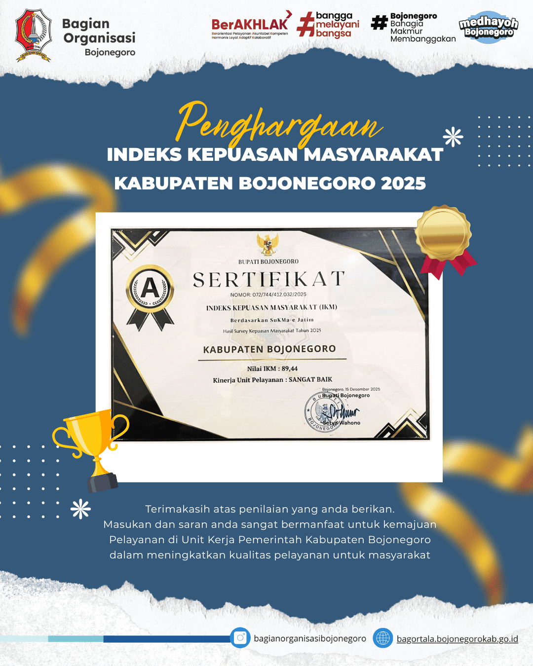 Bersama, kita wujudkan pelayanan publik Kabupaten Bojonegoro yang semakin prima dan membanggakan π
