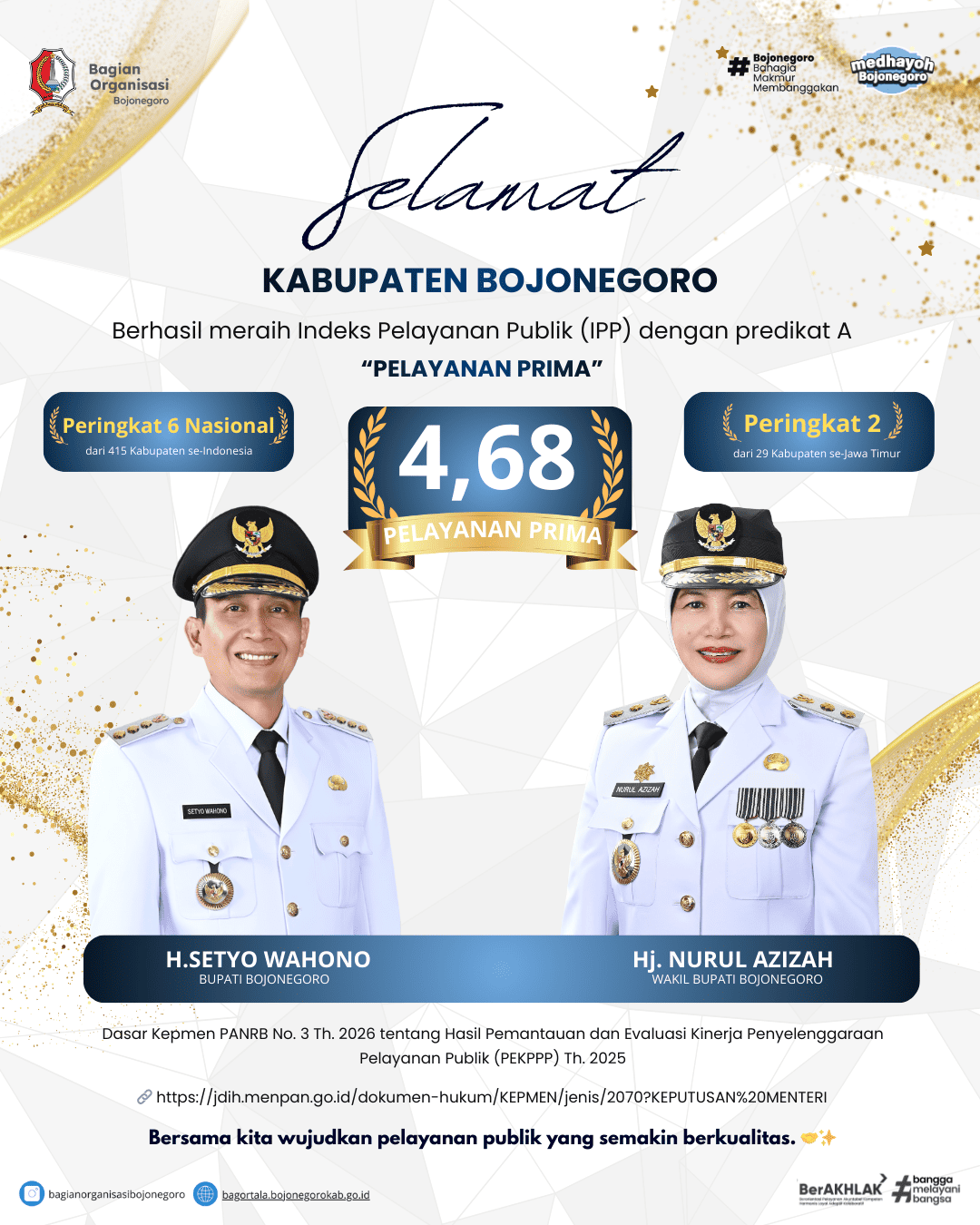 Dari hasil penilaian tersebut, IPP Kabupaten Bojonegoro berhasil memperoleh nilai 4,68 dengan Kategori A (Pelayanan Prima). Capaian ini menjadi bukti nyata komitmen dan konsistensi Pemkab Bojonegoro dalam menghadirkan pelayanan publik yang berkualitas, profesional, dan berorientasi pada kepuasan masyarakat.